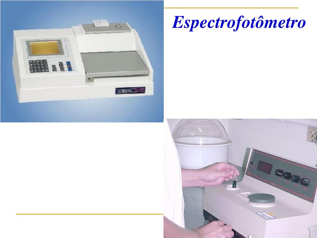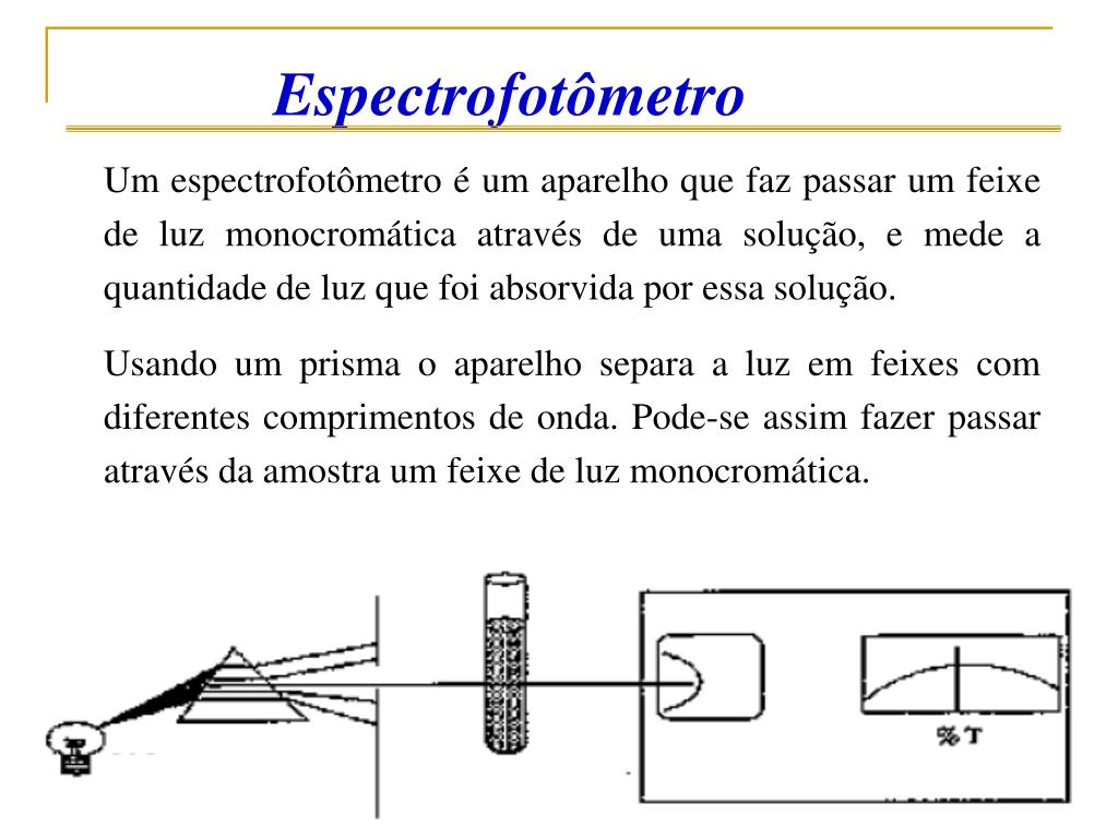 Espectrofotômetro Um espectrofotômetro é um aparelho que faz passar um feixe de luz monocromática através de uma solução, e mede a quantidade de luz que foi absorvida por essa solução. Usando um prisma o aparelho separa a luz em feixes com diferentes comprimentos de onda. Pode-se assim fazer passar através da amostra um feixe de luz monocromática.