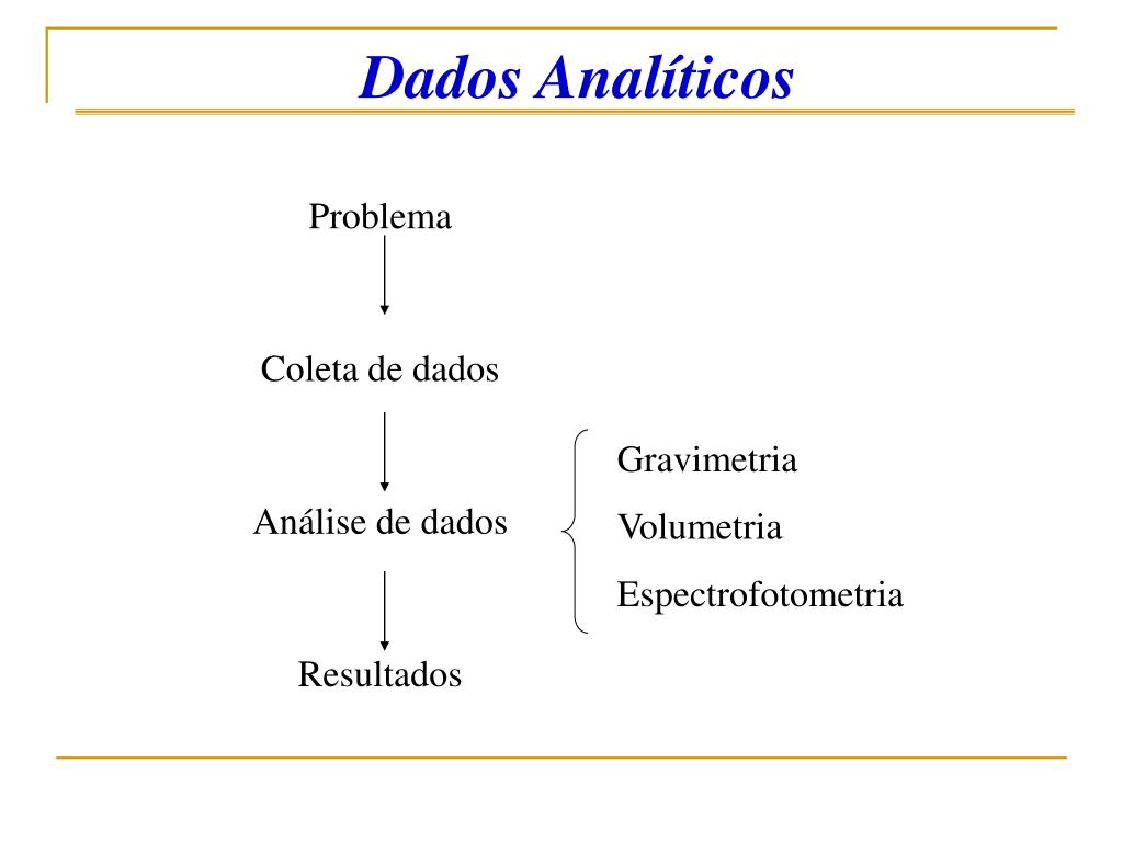 Dados Analíticos Problema Coleta de dados Análise de dados Resultados Gravimetria Volumetria Espectrofotometria