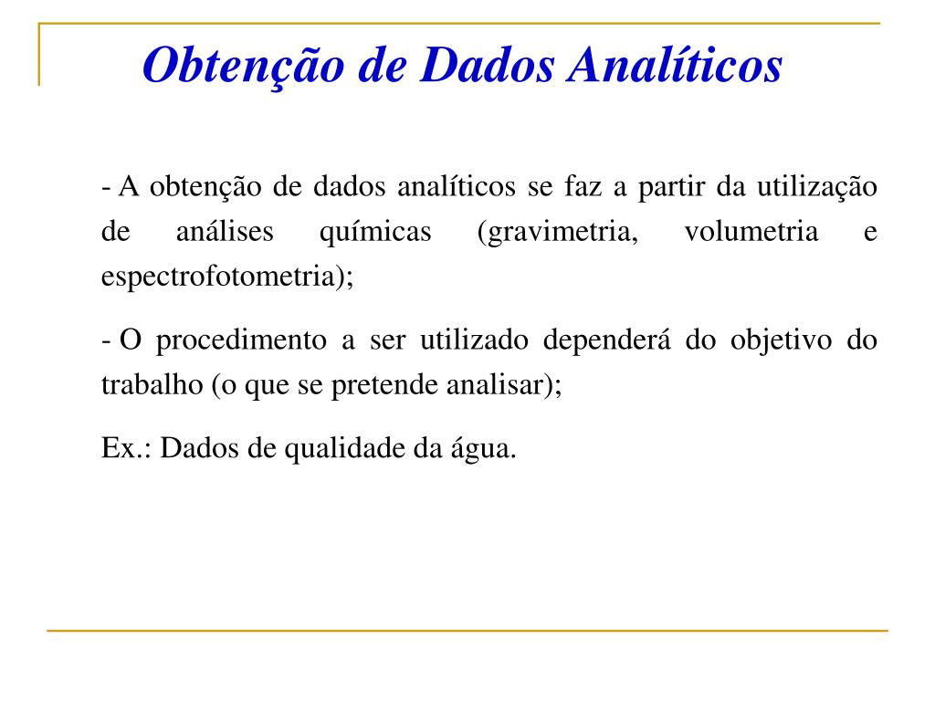 Obtenção de Dados Analíticos • A obtenção de dados analíticos se faz a partir da utilização de análises químicas (gravimetria, volumetria e espectrofotometria); • O procedimento a ser utilizado dependerá do objetivo do trabalho (o que se pretende analisar); • Ex.: Dados de qualidade da água.