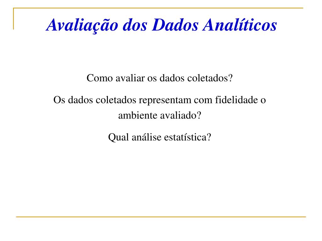 Avaliação dos Dados Analíticos Como avaliar os dados coletados? Os dados coletados representam com fidelidade o ambiente avaliado? Qual análise estatística?