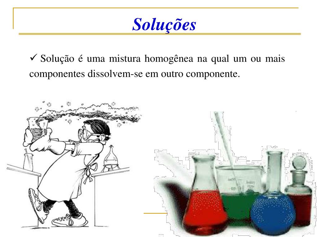 Soluções • Solução é uma mistura homogênea na qual um ou mais componentes dissolvem-se em outro componente.