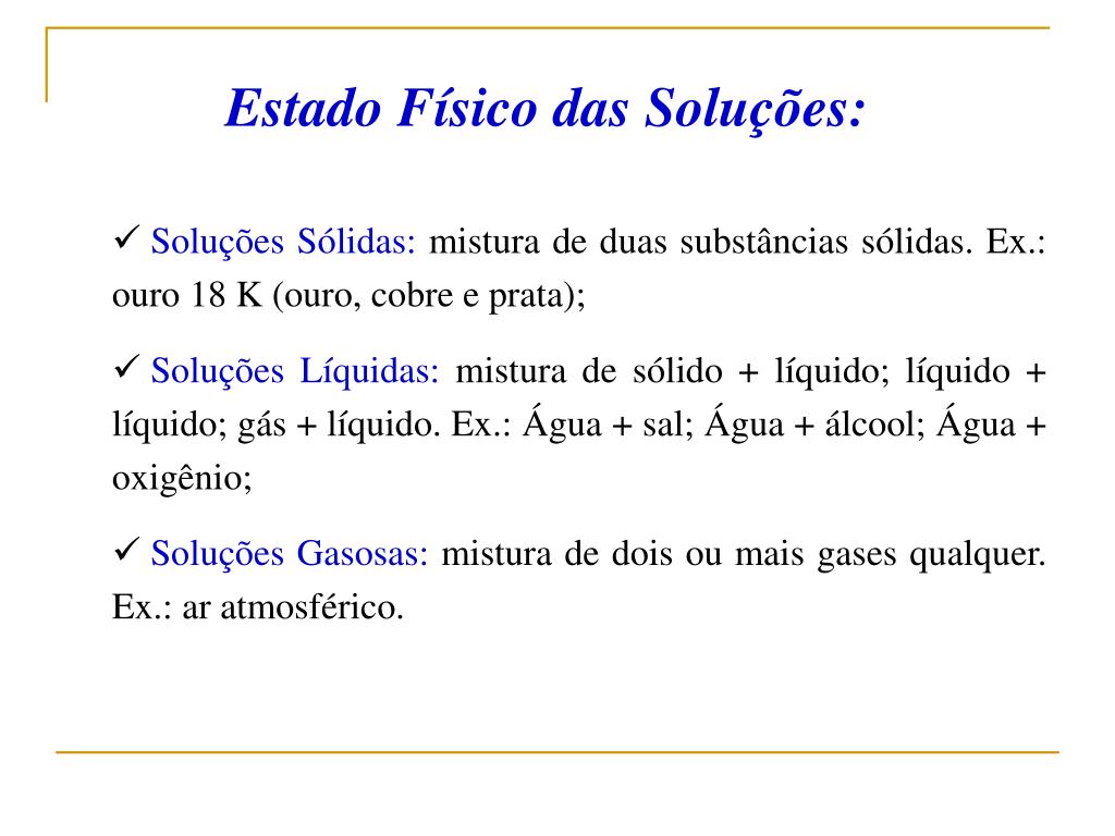 Estado Físico das Soluções: • Soluções Sólidas: mistura de duas substâncias sólidas. Ex.: ouro 18 K (ouro, cobre e prata); • Soluções Líquidas: mistura de sólido + líquido; líquido + líquido; gás + líquido. Ex.: Água + sal; Água + álcool; Água + oxigênio; • Soluções Gasosas: mistura de dois ou mais gases qualquer. Ex.: ar atmosférico.
