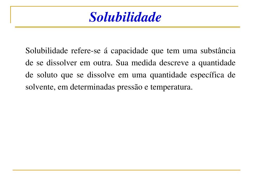 Solubilidade Solubilidade refere-se á capacidade que tem uma substância de se dissolver em outra. Sua medida descreve a quantidade de soluto que se dissolve em uma quantidade específica de solvente, em determinadas pressão e temperatura.