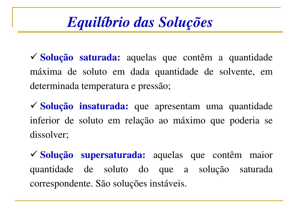 Equilíbrio das Soluções • Solução saturada: aquelas que contêm a quantidade máxima de soluto em dada quantidade de solvente, em determinada temperatura e pressão; • Solução insaturada: que apresentam uma quantidade inferior de soluto em relação ao máximo que poderia se dissolver; • Solução supersaturada: aquelas que contêm maior quantidade de soluto do que a solução saturada correspondente. São soluções instáveis.