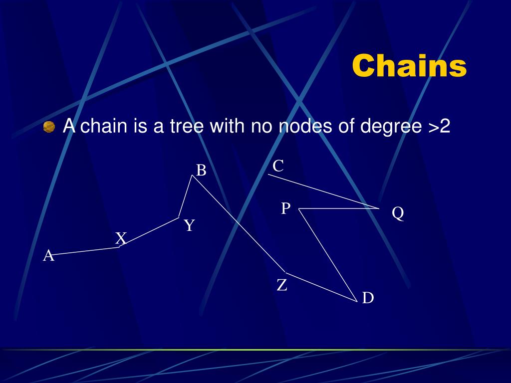 Chains • A chain is a tree with no nodes of degree >2 C B P Q Y X A Z D