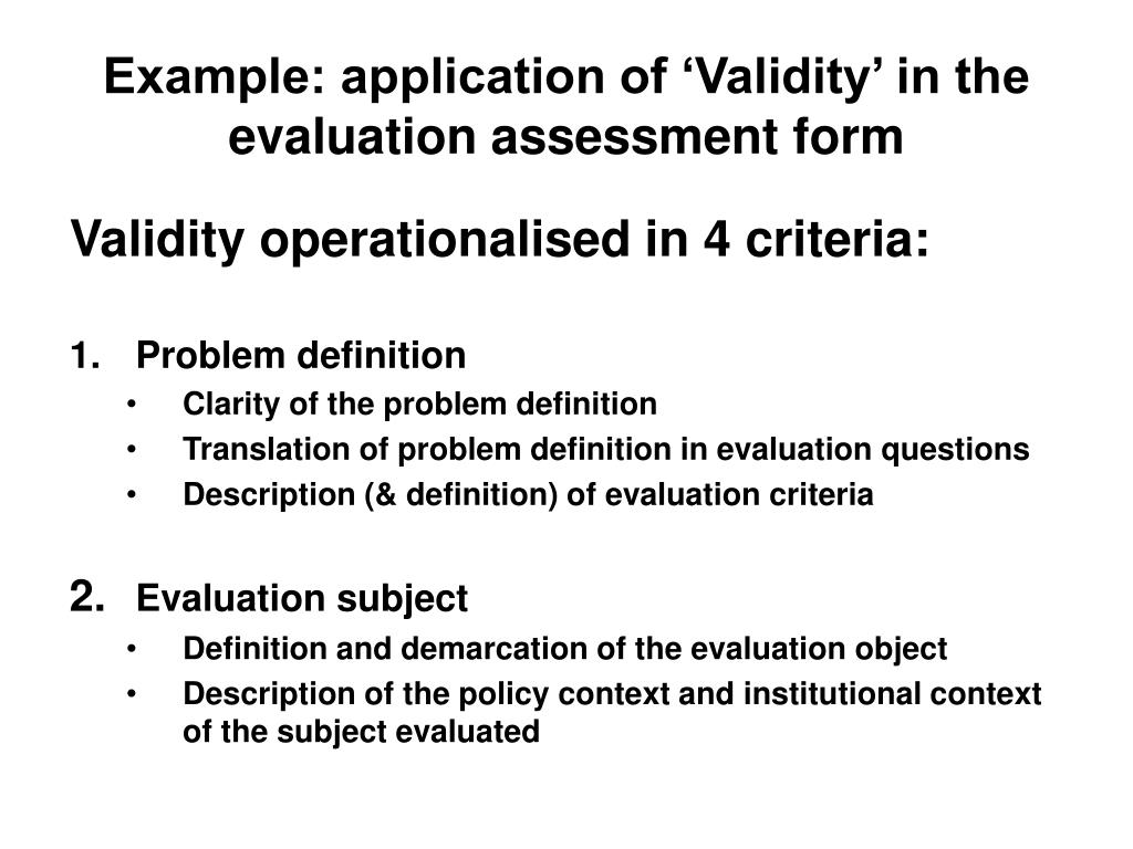 Example: application of ‘Validity’ in the evaluation assessment form Validity operationalised in 4 criteria: 1. Problem definition • Clarity of the problem definition • Translation of problem definition in evaluation questions • Description (& definition) of evaluation criteria 2. Evaluation subject • Definition and demarcation of the evaluation object • Description of the policy context and institutional context of the subject evaluated