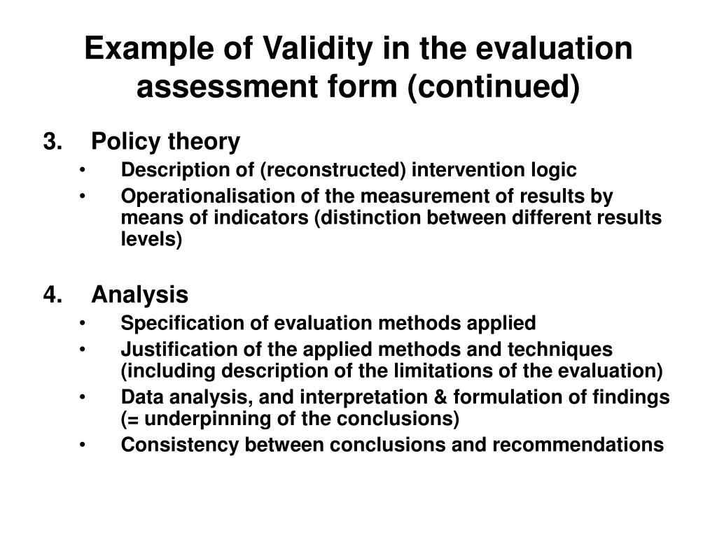 Example of Validity in the evaluation assessment form (continued) 3. Policy theory • Description of (reconstructed) intervention logic • Operationalisation of the measurement of results by means of indicators (distinction between different results levels) • Analysis • Specification of evaluation methods applied • Justification of the applied methods and techniques (including description of the limitations of the evaluation) • Data analysis, and interpretation & formulation of findings (= underpinning of the conclusions) • Consistency between conclusions and recommendations