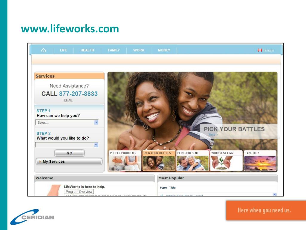 With www.lifeworks.com you can... Search for information confidentially under five categories – Work, Life, Family, Health & Money Find hundreds of expert articles as well as online toolkits, booklets, and recordings Listen to podcasts and audio recordings Use interactive tools on budgeting, investing, home buying, health and retirement planning Email a consultant with an inquiry or arrange a call Order materials for delivery such as booklets, CDs and packets