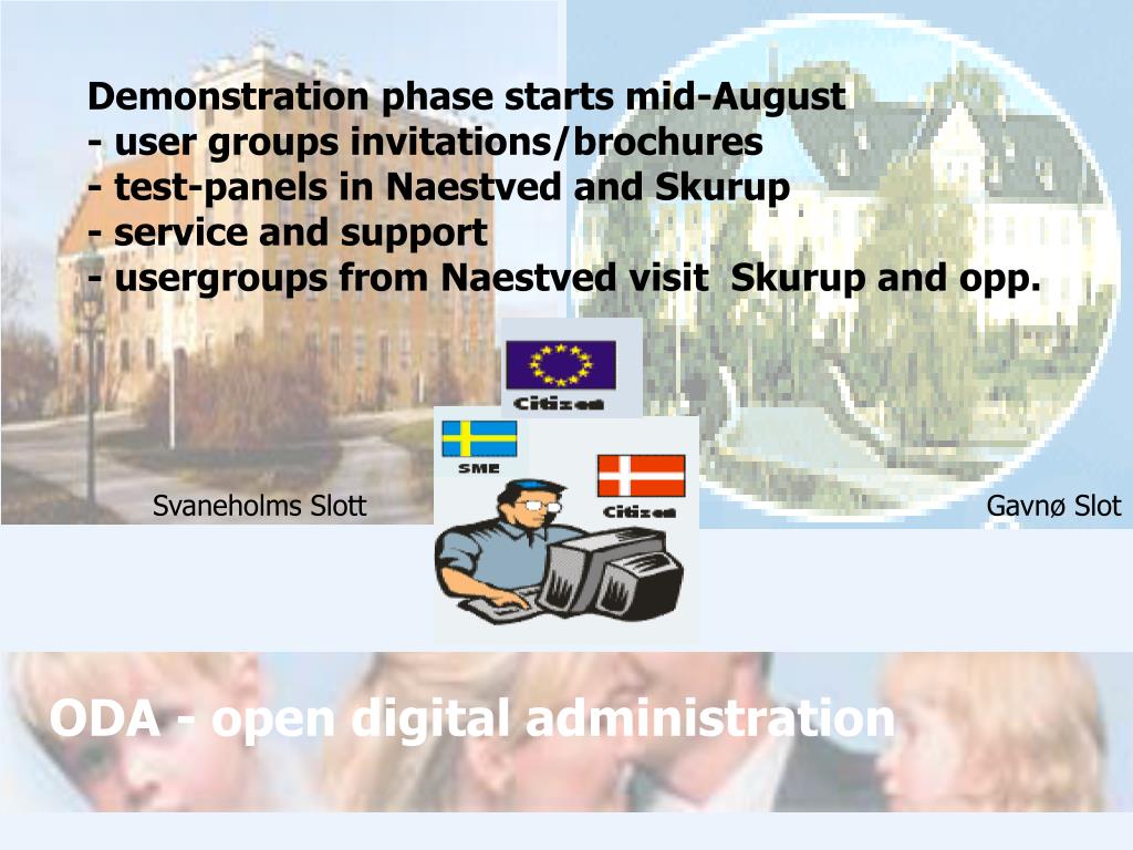 Demonstration phase starts mid-August - user groups invitations/brochures - test-panels in Naestved and Skurup - service and support - usergroups from Naestved visit Skurup and opp. Svaneholms Slott Gavnø Slot ODA - open digital administration