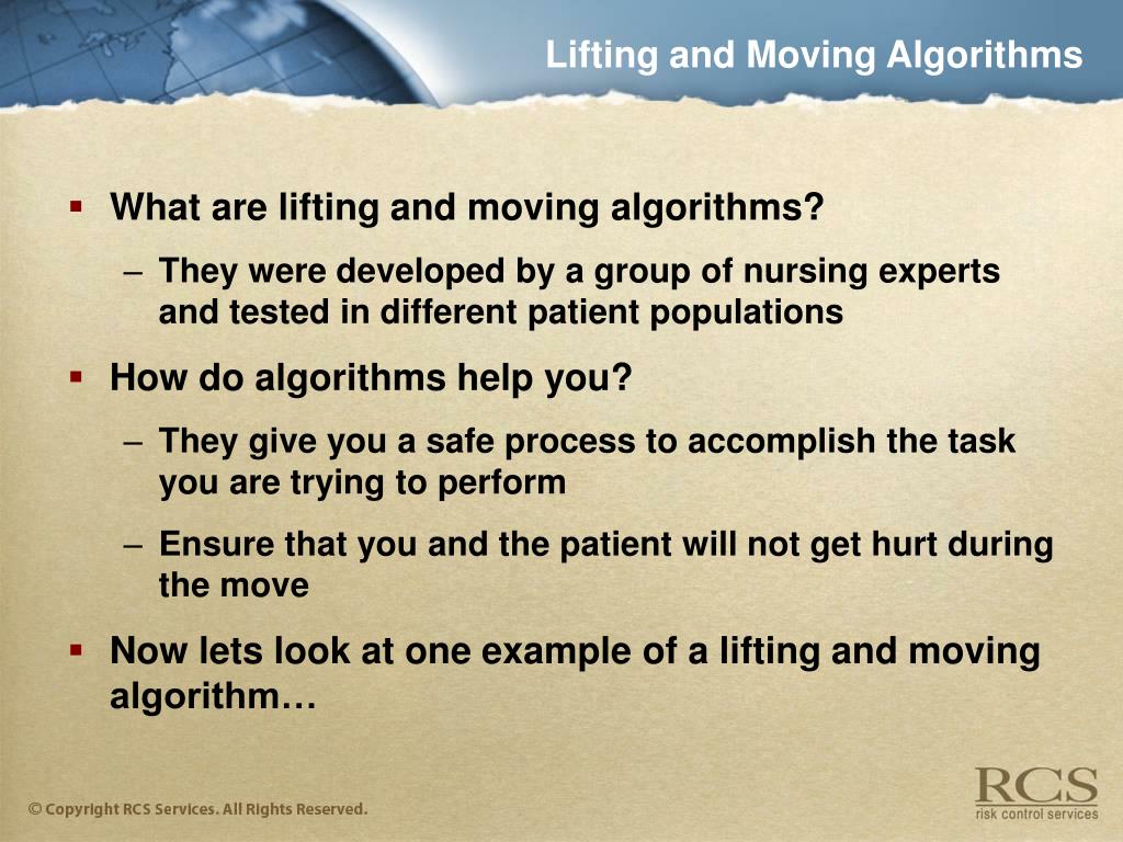 Lifting and Moving Algorithms • What are lifting and moving algorithms? • They were developed by a group of nursing experts and tested in different patient populations • How do algorithms help you? • They give you a safe process to accomplish the task you are trying to perform • Ensure that you and the patient will not get hurt during the move • Now lets look at one example of a lifting and moving algorithm…