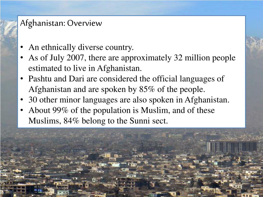 Afghanistan: Overview • An ethnically diverse country. • As of July 2007, there are approximately 32 million people estimated to live in Afghanistan. • Pashtu and Dari are considered the official languages of Afghanistan and are spoken by 85% of the people. • 30 other minor languages are also spoken in Afghanistan. • About 99% of the population is Muslim, and of these Muslims, 84% belong to the Sunni sect.