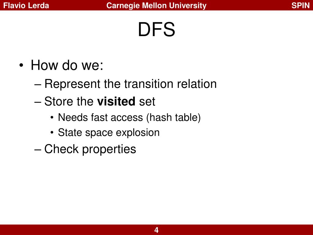 SPIN. An explicit state model checker. Explict State Model Checker. Represents the system as an finite state machine Visits each reachable state (state space) explicitly Checks some property Property is satisfied Counterexample. DFS. DFS visit of the state space procedure DFS ( s )