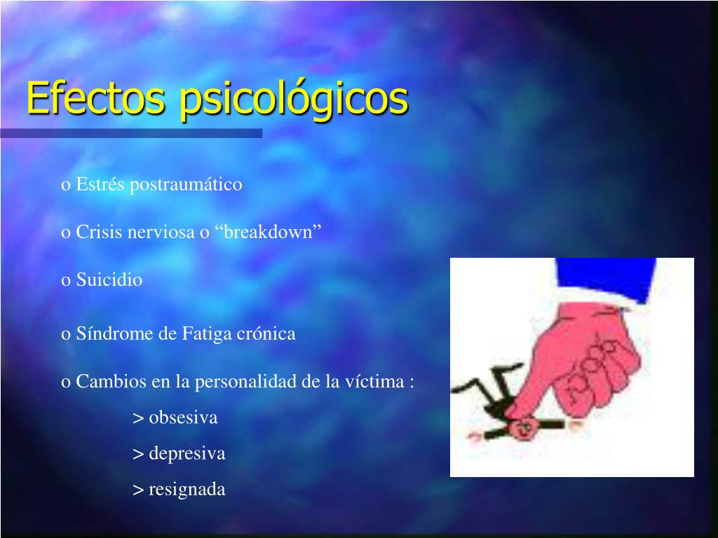 Efectos psicológicos • Estrés postraumático • Crisis nerviosa o “breakdown” • Suicidio • Síndrome de Fatiga crónica • Cambios en la personalidad de la víctima : • > obsesiva • > depresiva • > resignada