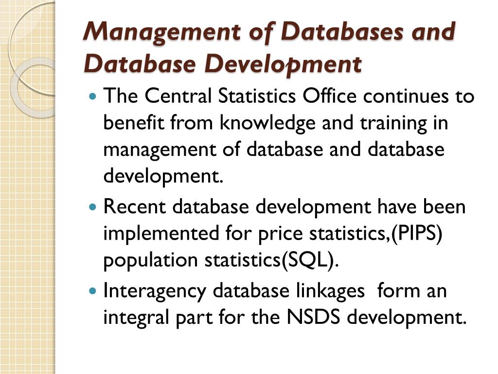 Management of Databases and Database Development • The Central Statistics Office continues to benefit from knowledge and training in management of database and database development. • Recent database development have been implemented for price statistics,(PIPS) population statistics(SQL). • Interagency database linkages form an integral part for the NSDS development.