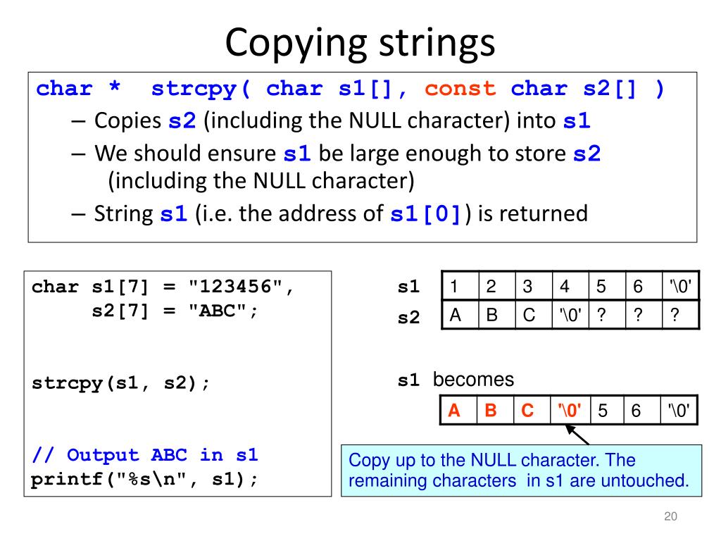 strncpy() (Examples) char s1[7] = "123456", s2[7] = "ABC"; strncpy(s1, s2, 2); // output AB3456 printf("%s\n", s1); strncpy(s1, s2, 10); // output ABC printf("%s\n", s1); strncpy(s2, "12345", 4); // Warning! s2 may NOT be // NULL terminated! s1 s2 s1 becomes s1 becomes s2 becomes