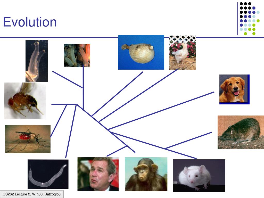Cross-species genome similarity • 98% of genes are conserved between any two mammals • >70% average similarity in protein sequence hum_a : GTTGACAATAGAGGGTCTGGCAGAGGCTC--------------------- @ 57331/400001 mus_a : GCTGACAATAGAGGGGCTGGCAGAGGCTC--------------------- @ 78560/400001 rat_a : GCTGACAATAGAGGGGCTGGCAGAGACTC--------------------- @ 112658/369938 fug_a : TTTGTTGATGGGGAGCGTGCATTAATTTCAGGCTATTGTTAACAGGCTCG @ 36008/68174 hum_a : CTGGCCGCGGTGCGGAGCGTCTGGAGCGGAGCACGCGCTGTCAGCTGGTG @ 57381/400001 mus_a : CTGGCCCCGGTGCGGAGCGTCTGGAGCGGAGCACGCGCTGTCAGCTGGTG @ 78610/400001 rat_a : CTGGCCCCGGTGCGGAGCGTCTGGAGCGGAGCACGCGCTGTCAGCTGGTG @ 112708/369938 fug_a : TGGGCCGAGGTGTTGGATGGCCTGAGTGAAGCACGCGCTGTCAGCTGGCG @ 36058/68174 hum_a : AGCGCACTCTCCTTTCAGGCAGCTCCCCGGGGAGCTGTGCGGCCACATTT @ 57431/400001 mus_a : AGCGCACTCG-CTTTCAGGCCGCTCCCCGGGGAGCTGAGCGGCCACATTT @ 78659/400001 rat_a : AGCGCACTCG-CTTTCAGGCCGCTCCCCGGGGAGCTGCGCGGCCACATTT @ 112757/369938 fug_a : AGCGCTCGCG------------------------AGTCCCTGCCGTGTCC @ 36084/68174 hum_a : AACACCATCATCACCCCTCCCCGGCCTCCTCAACCTCGGCCTCCTCCTCG @ 57481/400001 mus_a : AACACCGTCGTCA-CCCTCCCCGGCCTCCTCAACCTCGGCCTCCTCCTCG @ 78708/400001 rat_a : AACACCGTCGTCA-CCCTCCCCGGCCTCCTCAACCTCGGCCTCCTCCTCG @ 112806/369938 fug_a : CCGAGGACCCTGA------------------------------------- @ 36097/68174 “atoh” enhancer in human, mouse, rat, fugu fish