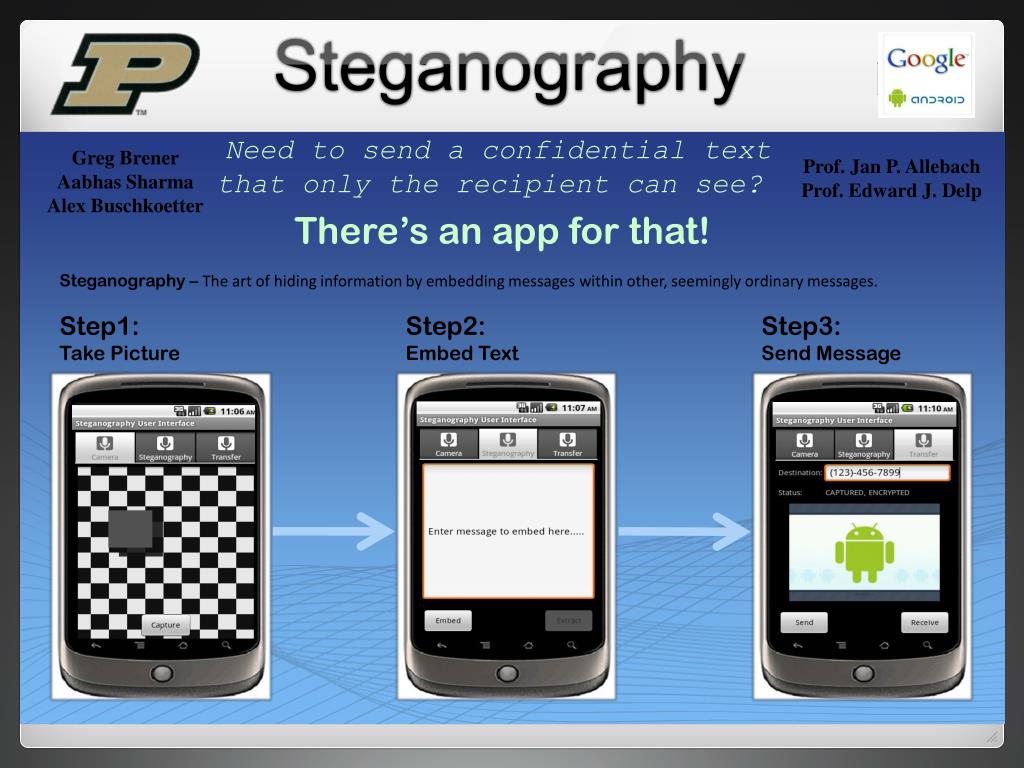 Steganography. Need to send a confidential text that only the recipient can see? . Greg Brener Aabhas Sharma Alex Buschkoetter. Prof. Jan P. Allebach Prof. Edward J. Delp. There’s an app for that!.