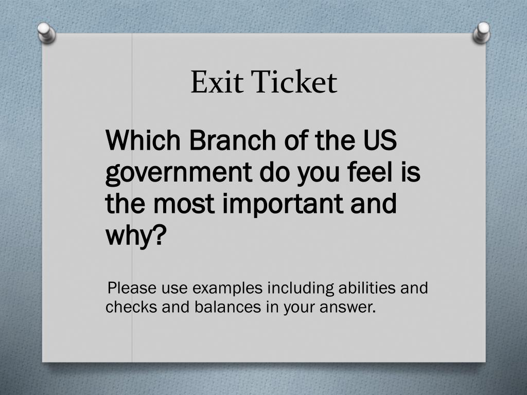 Exit Ticket Which Branch of the US government do you feel is the most important and why? Please use examples including abilities and checks and balances in your answer.