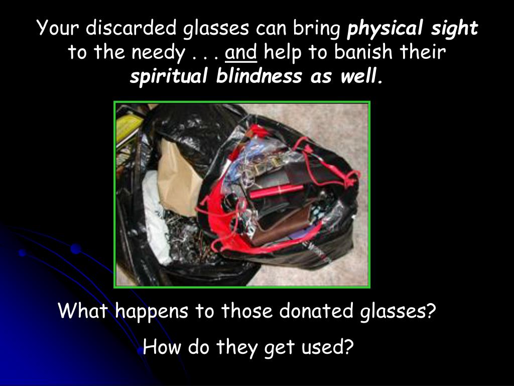 Your discarded glasses can bring physical sight to the needy . . . and help to banish their spiritual blindness as well. What happens to those donated glasses? How do they get used?