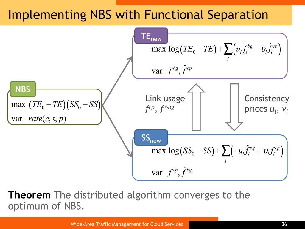 Implementing NBS with Functional Separation TEnew NBS SSnew Link usage fcp, f^bg Consistency prices ul, vl • Theorem The distributed algorithm converges to the optimum of NBS. Wide-Area Traffic Management for Cloud Services