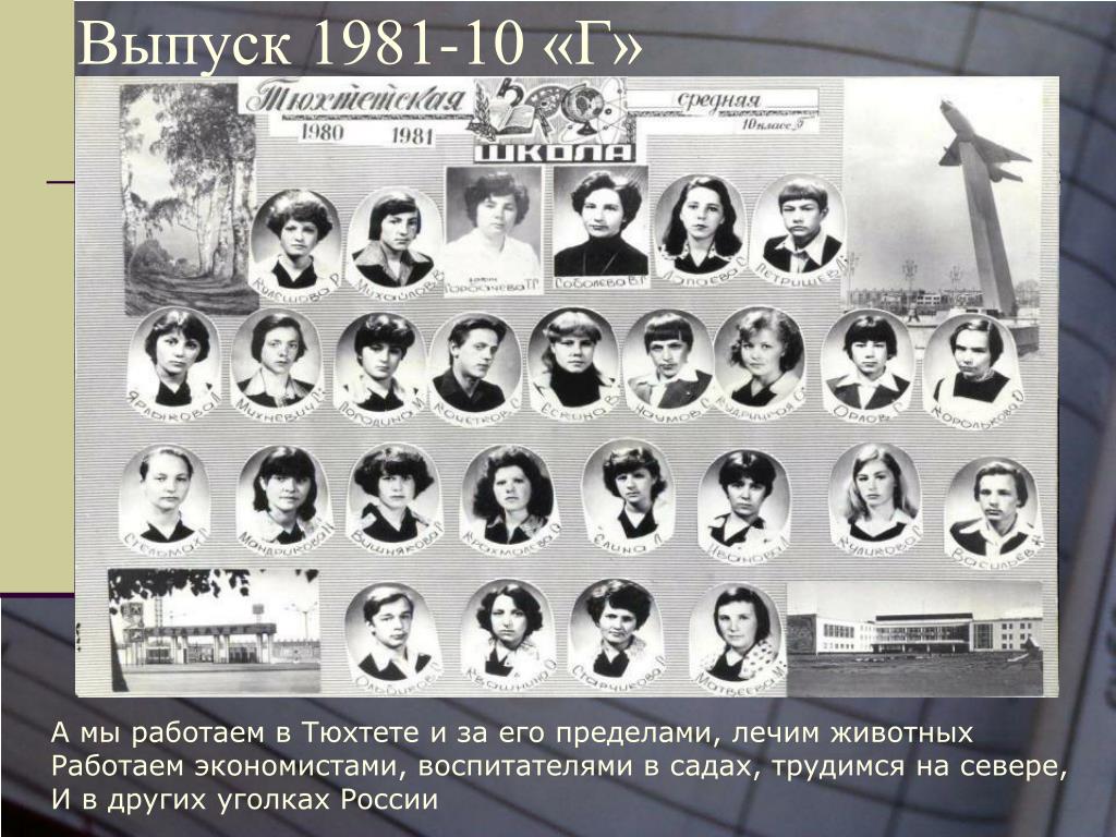 Выпуск 1980-10 «Г» класс Мы тоже трудимся в родных школах, общепите , доме культуре и за пределами Тюхтета