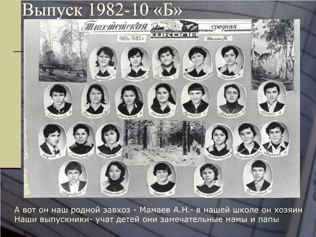 Выпуск 1982-10 «Б» А вот он наш родной завхоз - Мамаев А.Н.- в нашей школе он хозяин Наши выпускники- учат детей они замечательные мамы и папы