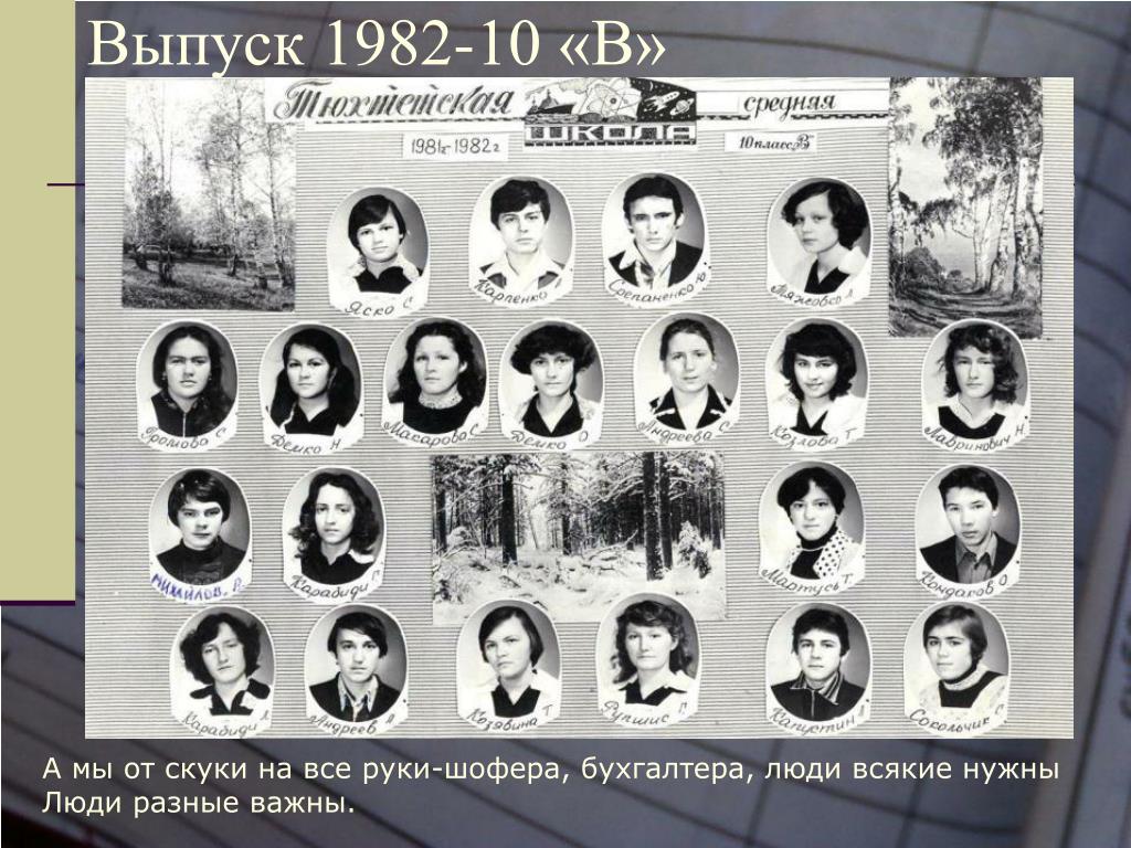 Выпуск 1983-10 «Б» А среди нас много медиков, есть педагоги юристы и работники торговли и большинство из нас трудятся в родном Тюхтете