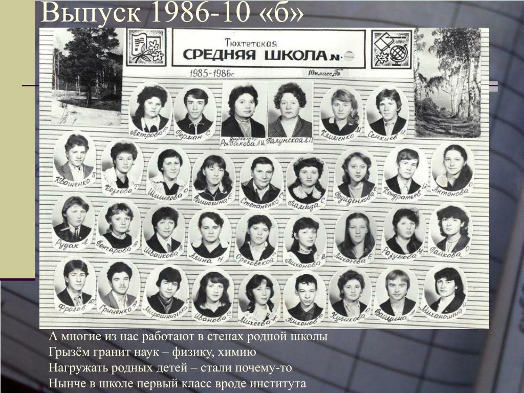 Выпуск 1984-10 «А» Многие из нас тоже вернулись в родное село и работаем в школах, в ПУ, паспортной службе у нас есть предприниматели и лучше Тюхтета нет ничего.