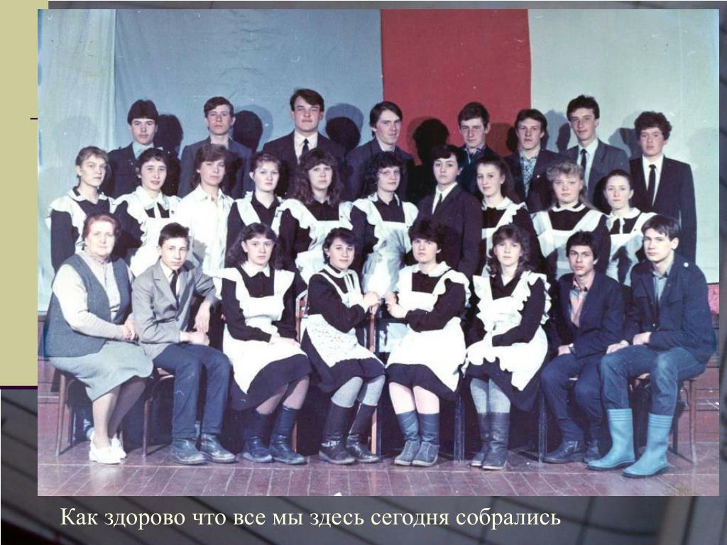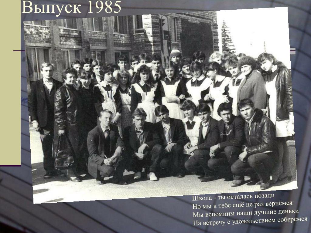 Выпуск 1985 Школа - ты осталась позади Но мы к тебе ещё не раз вернёмся Мы вспомним наши лучшие деньки На встречу с удовольствием соберемся