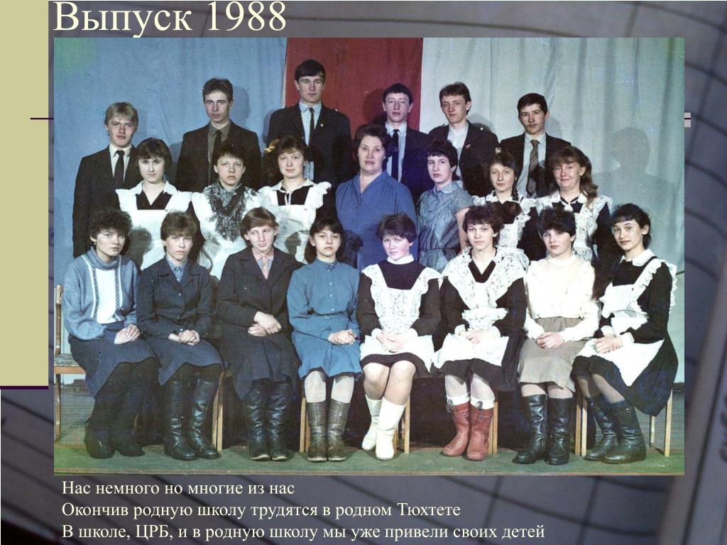 Выпуск 1988 Нас немного но многие из нас Окончив родную школу трудятся в родном Тюхтете В школе, ЦРБ, и в родную школу мы уже привели своих детей