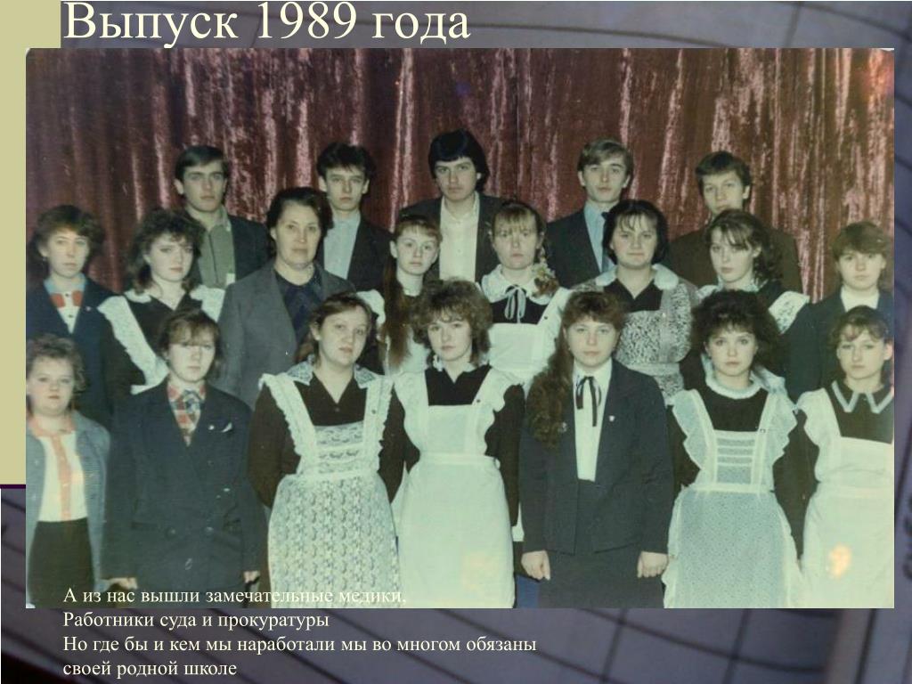 Выпуск 1989 года А из нас вышли замечательные медики, Работники суда и прокуратуры Но где бы и кем мы наработали мы во многом обязаны своей родной школе