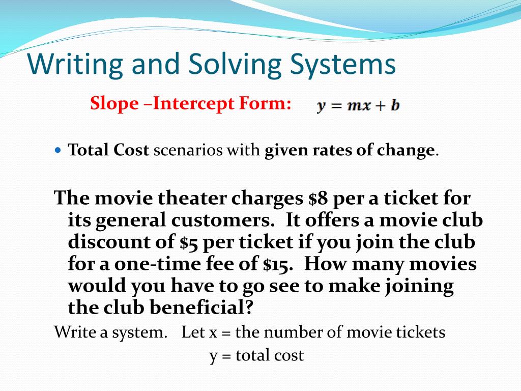 Writing and Solving Systems Slope –Intercept Form: • Total Cost scenarios with given rates of change. The movie theater charges $8 per a ticket for its general customers. It offers a movie club discount of $5 per ticket if you join the club for a one-time fee of $15. How many movies would you have to go see to make joining the club beneficial? Write a system. Let x = the number of movie tickets y = total cost