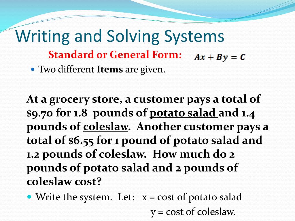 Writing and Solving Systems Standard or General Form: • Two different Items are given. At a grocery store, a customer pays a total of $9.70 for 1.8 pounds of potato salad and 1.4 pounds of coleslaw. Another customer pays a total of $6.55 for 1 pound of potato salad and 1.2 pounds of coleslaw. How much do 2 pounds of potato salad and 2 pounds of coleslaw cost? • Write the system. Let: x = cost of potato salad y = cost of coleslaw.