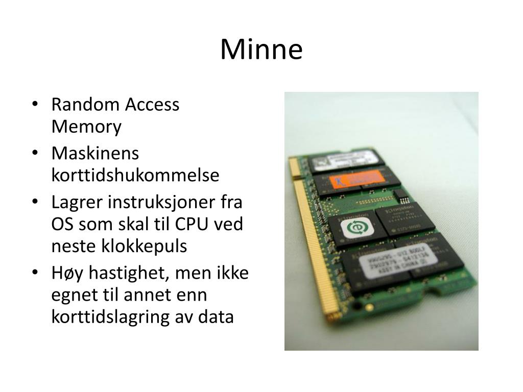 Minne • Random Access Memory • Maskinens korttidshukommelse • Lagrer instruksjoner fra OS som skal til CPU ved neste klokkepuls • Høy hastighet, men ikke egnet til annet enn korttidslagring av data