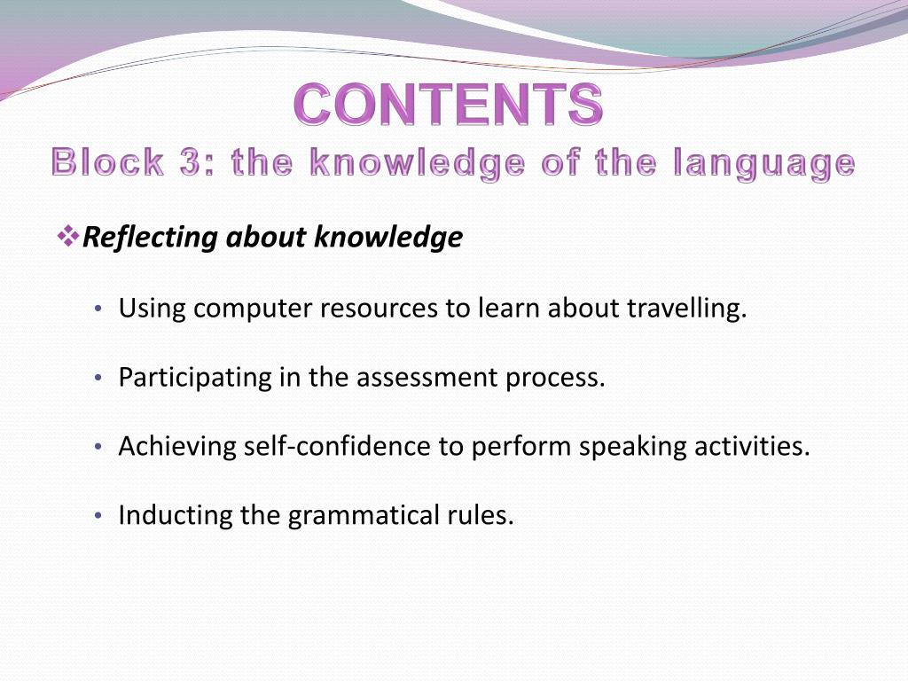 CONTENTS Block 3: theknowledge of thelanguage • Reflecting about knowledge • Using computer resources to learn about travelling. • Participating in the assessment process. • Achieving self-confidence to perform speaking activities. • Inducting the grammatical rules.