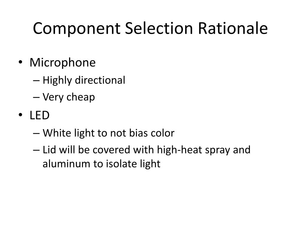 Component Selection Rationale • Microphone • Highly directional • Very cheap • LED • White light to not bias color • Lid will be covered with high-heat spray and aluminum to isolate light