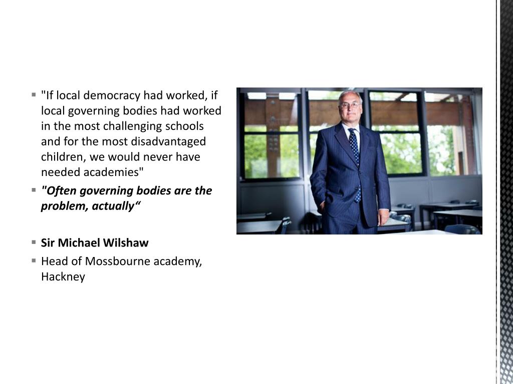 "If local democracy had worked, if local governing bodies had worked in the most challenging schools and for the most disadvantaged children, we would never have needed academies" • "Often governing bodies are the problem, actually“ • Sir Michael Wilshaw • Head of Mossbourne academy, Hackney
