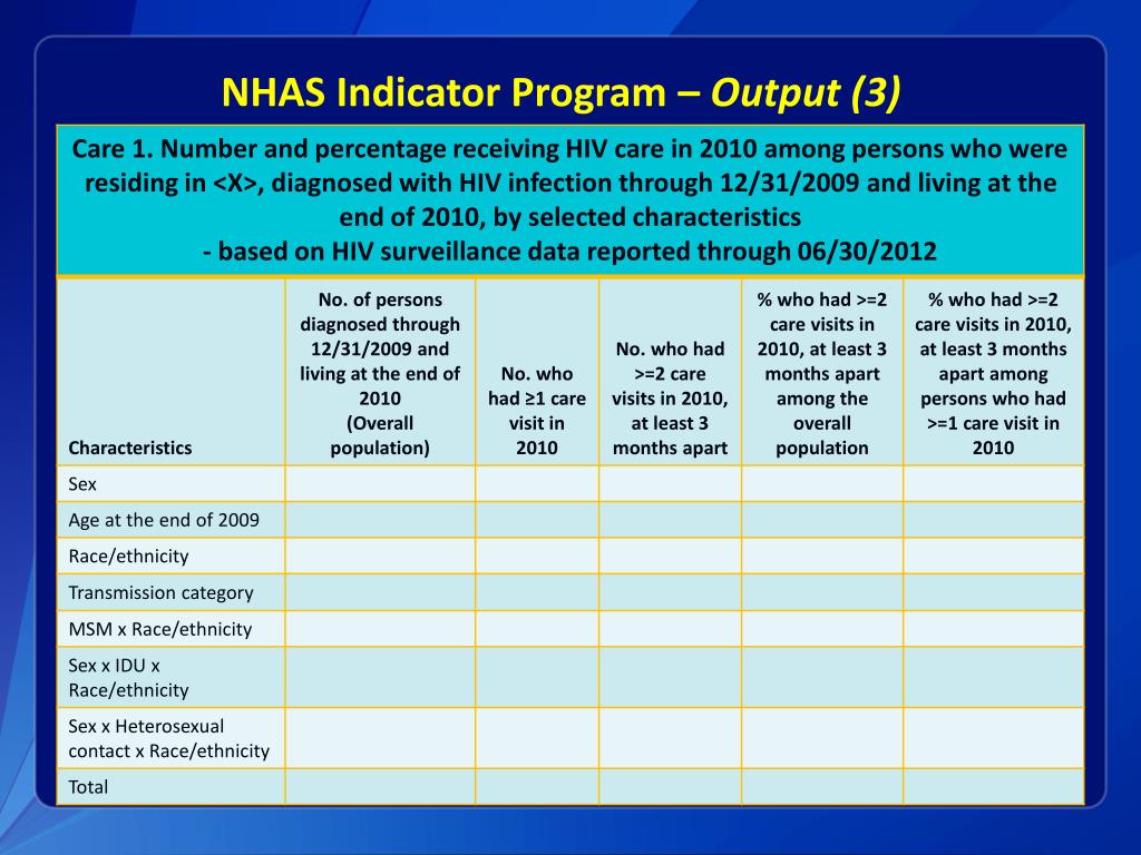 National HIV/AIDS Strategy (NHAS)Indicator Program • CDC developed a SAS program to assist local and state HIV surveillance programs to assess: • Linkage to care within 3, 6, and 12 months following HIV infection diagnosis, and • Retention in care and viral load suppression among persons living with diagnosed HIV infection • The fully automated SAS program was made available on HICSB’s SiteScape (now SharePoint) on January 12, 2012