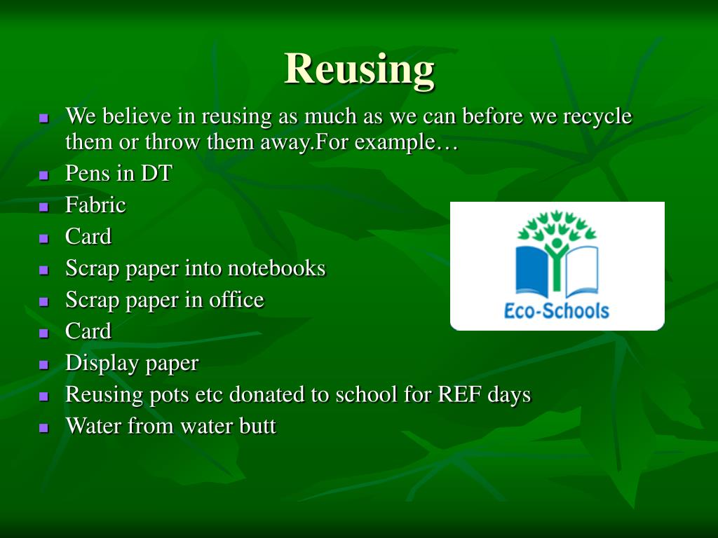 Reusing • We believe in reusing as much as we can before we recycle them or throw them away.For example… • Pens in DT • Fabric • Card • Scrap paper into notebooks • Scrap paper in office • Card • Display paper • Reusing pots etc donated to school for REF days • Water from water butt