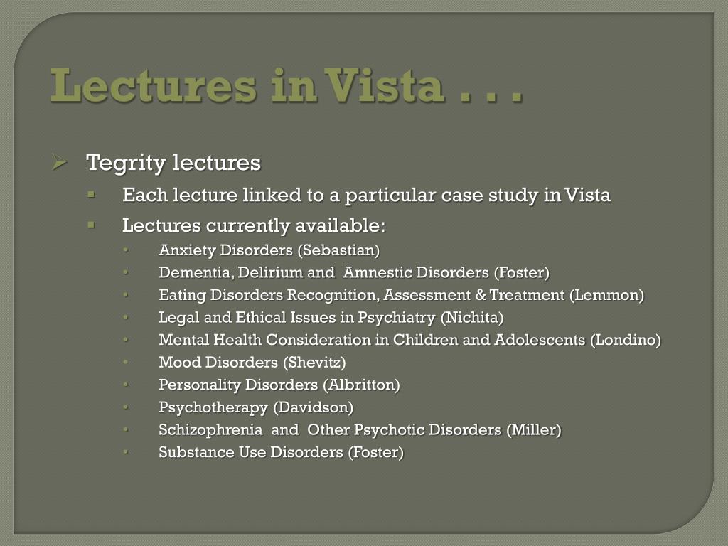 Lectures in Vista . . . • Tegrity lectures • Each lecture linked to a particular case study in Vista • Lectures currently available: • Anxiety Disorders (Sebastian) • Dementia, Delirium and Amnestic Disorders (Foster) • Eating Disorders Recognition, Assessment & Treatment (Lemmon) • Legal and Ethical Issues in Psychiatry (Nichita) • Mental Health Consideration in Children and Adolescents (Londino) • Mood Disorders (Shevitz) • Personality Disorders (Albritton) • Psychotherapy (Davidson) • Schizophrenia and Other Psychotic Disorders (Miller) • Substance Use Disorders (Foster)