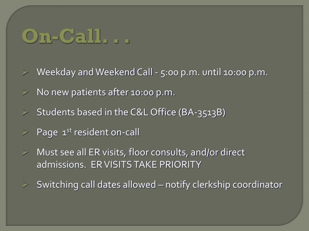 On-Call. . . • Weekday and Weekend Call - 5:00 p.m. until 10:00 p.m. • No new patients after 10:00 p.m. • Students based in the C&L Office (BA-3513B) • Page 1st resident on-call • Must see all ER visits, floor consults, and/or direct admissions. ER VISITS TAKE PRIORITY • Switching call dates allowed – notify clerkship coordinator