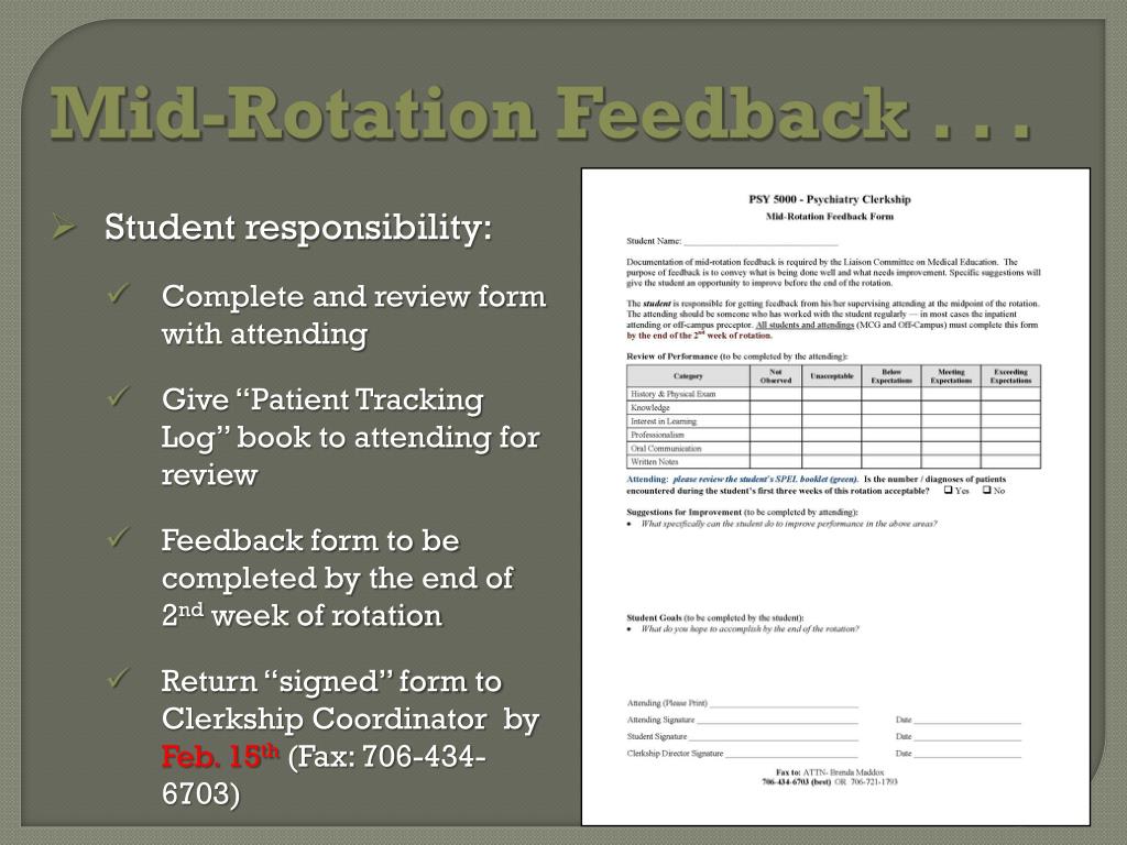Mid-Rotation Feedback . . . • Student responsibility: • Complete and review form with attending • Give “Patient Tracking Log” book to attending for review • Feedback form to be completed by the end of 2nd week of rotation • Return “signed” form to Clerkship Coordinator by Feb. 15th(Fax: 706-434-6703)