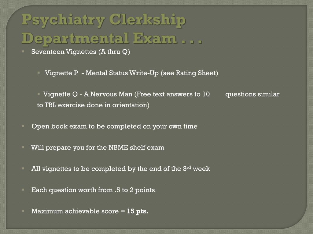Psychiatry Clerkship Departmental Exam . . . • Seventeen Vignettes (A thru Q) • Vignette P - Mental Status Write-Up (see Rating Sheet) • Vignette Q - A Nervous Man (Free text answers to 10 questions similar to TBL exercise done in orientation) • Open book exam to be completed on your own time • Will prepare you for the NBME shelf exam • All vignettes to be completed by the end of the 3rd week • Each question worth from .5 to 2 points • Maximum achievable score = 15 pts.