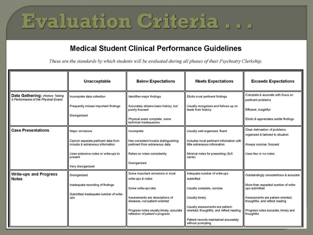Objectives for the Clerkship . . . • Patient Care • Gather essential and accurate patient information • Use the information to care for psychiatry patients • Medical Knowledge • Develop a working knowledge of psychiatric diagnoses • Develop a working knowledge of major classes of psychotropic medications, indications, contraindications and side effects • Practice-Based Learning and Improvement • Obtain and critically evaluate medical literature using electronic resources