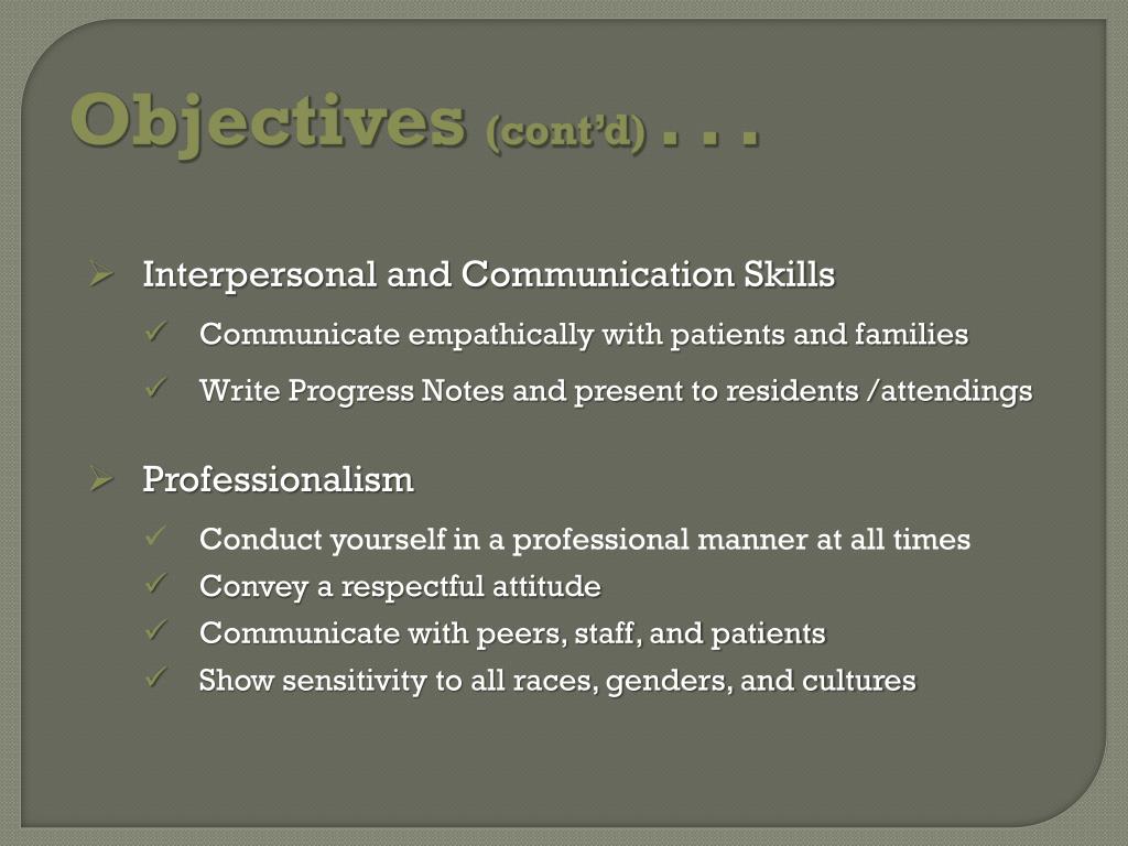Objectives (cont’d) . . . • Interpersonal and Communication Skills • Communicate empathically with patients and families • Write Progress Notes and present to residents /attendings • Professionalism • Conduct yourself in a professional manner at all times • Convey a respectful attitude • Communicate with peers, staff, and patients • Show sensitivity to all races, genders, and cultures