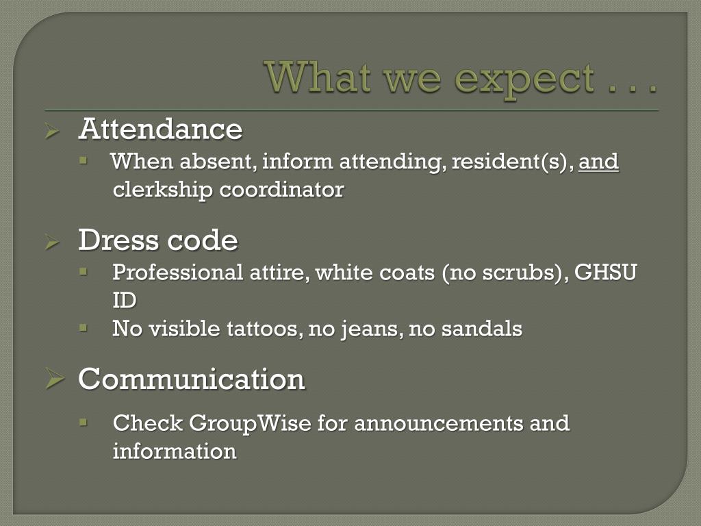 What we expect . . . • Attendance • When absent, inform attending, resident(s), and • clerkship coordinator • Dress code • Professional attire, white coats (no scrubs), GHSU ID • No visible tattoos, no jeans, no sandals • Communication • Check GroupWise for announcements and information