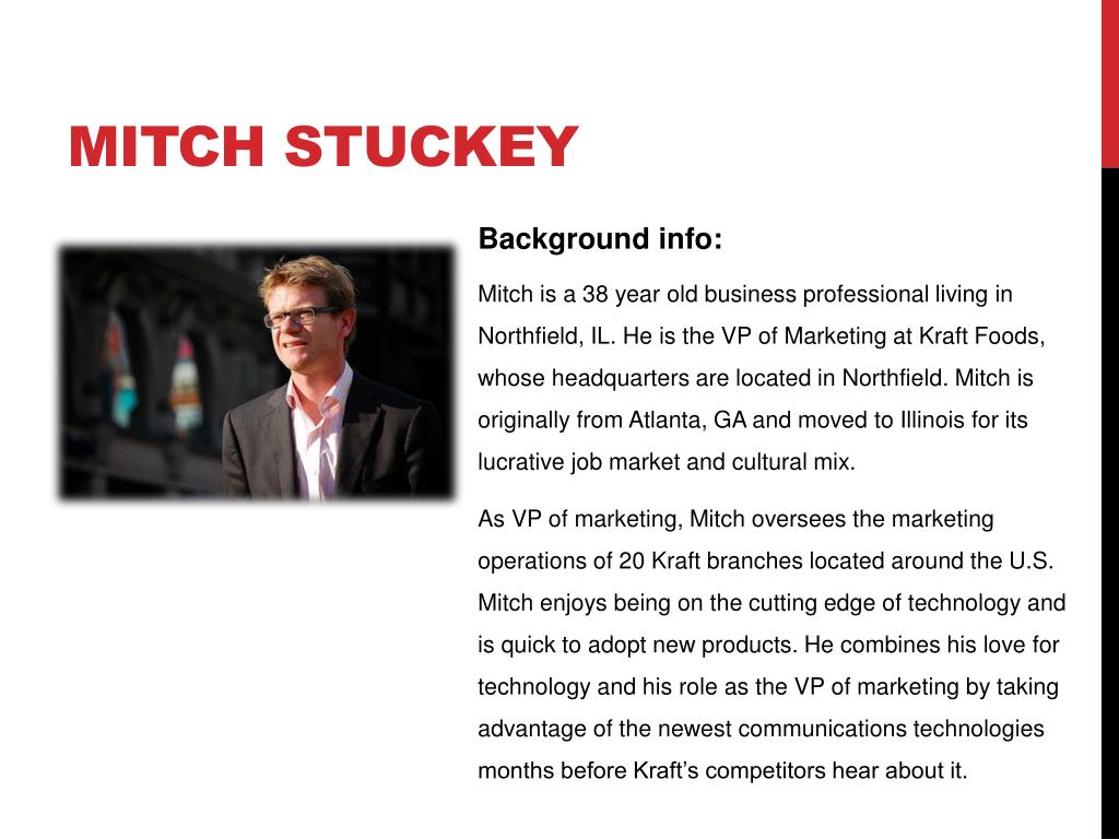 Mitch stuckey • Background info: • Mitch is a 38 year old business professional living in Northfield, IL. He is the VP of Marketing at Kraft Foods, whose headquarters are located in Northfield. Mitch is originally from Atlanta, GA and moved to Illinois for its lucrative job market and cultural mix. • As VP of marketing, Mitch oversees the marketing operations of 20 Kraft branches located around the U.S. Mitch enjoys being on the cutting edge of technology and is quick to adopt new products. He combines his love for technology and his role as the VP of marketing by taking advantage of the newest communications technologies months before Kraft’s competitors hear about it.