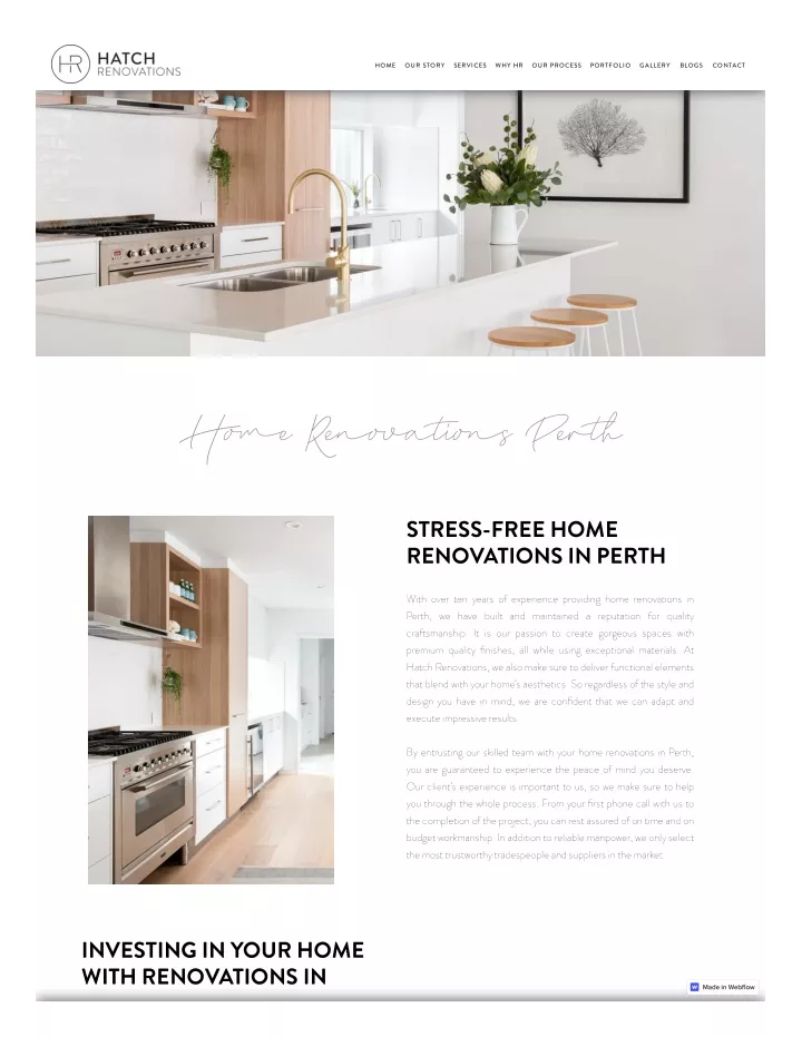 HOME OUR STORY SERVICES WHY HR OUR PROCESS PORTFOLIO GALLERY BLOGS CONTACT H ome R enova t ions P er t h STRESS-FREE HOME RENOVATIONS IN PERTH With over ten years of experience providing home renovations in Perth, we have built and maintained a reputation for quality craftsmanship. It is our passion to create gorgeous spaces with premium quality finishes, all while using exceptional materials. At Hatch Renovations, we also make sure to deliver functional elements that blend with your home’s aesthetics. So regardless of the style and design you have in mind, we are confident that we can adapt and execute impressive results. By entrusting our skilled team with your home renovations in Perth, you are guaranteed to experience the peace of mind you deserve. Our client’s experience is important to us, so we make sure to help you through the whole process. From your first phone call with us to the completion of the project, you can rest assured of on time and on budget workmanship. In addition to reliable manpower, we only select the most trustworthy tradespeople and suppliers in the market. INVESTING IN YOUR HOME WITH RENOVATIONS IN