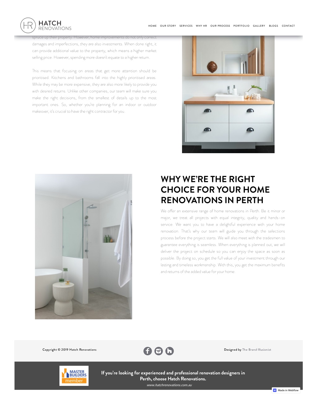 PERTH HOME OUR STORY SERVICES WHY HR OUR PROCESS PORTFOLIO GALLERY BLOGS CONTACT Usually, home renovations in Perth are completed because owners want to spruce up their property. However, home improvements do not only correct damages and imperfections, they are also investments. When done right, it can provide additional value to the property, which means a higher market selling price. However, spending more doesn’t equate to a higher return. This means that focusing on areas that get more attention should be prioritised. Kitchens and bathrooms fall into the highly prioritised areas. While they may be more expensive, they are also more likely to provide you with desired returns. Unlike other companies, our team will make sure you make the right decisions, from the smallest of details up to the most important ones. So, whether you’re planning for an indoor or outdoor makeover, it’s crucial to have the right contractor for you. WHY WE’RE THE RIGHT CHOICE FOR YOUR HOME RENOVATIONS IN PERTH We o?er an extensive range of home renovations in Perth. Be it minor or major, we treat all projects with equal integrity, quality and hands-on service. We want you to have a delightful experience with your home renovation. That’s why our team will guide you through the selections process before the project starts. We will also meet with the tradesmen to guarantee everything is seamless. When everything is planned out, we will deliver the project on schedule so you can enjoy the space as soon as possible. By doing so, you get the full value of your investment through our lasting and timeless workmanship. With this, you get the maximum benefits and returns of the added value for your home. Copyright © 2019 Hatch Renovations Designed by The Brand Illusionist If you’re looking for experienced and professional renovation designers in Perth, choose Hatch Renovations. www.hatchrenovations.com.au