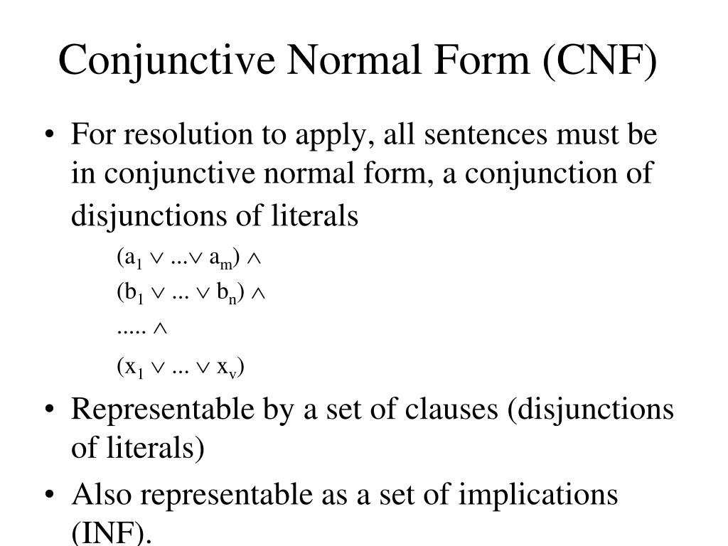 Conjunctive Normal Form (CNF) • For resolution to apply, all sentences must be in conjunctive normal form, a conjunction of disjunctions of literals (a1Ú ...Ú am) Ù (b1Ú ... Ú bn) Ù ..... Ù (x1Ú ... Ú xv) • Representable by a set of clauses (disjunctions of literals) • Also representable as a set of implications (INF).